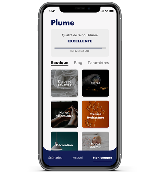 Plume est équipée de filtres qui retiennent la pollution, les bactéries et tout autres allergènes suceptibles de perturber votre sommeil. Vous pouvez suivre l'état d'usure de votre filtre depuis l'application et en commander un nouveau en un clic.