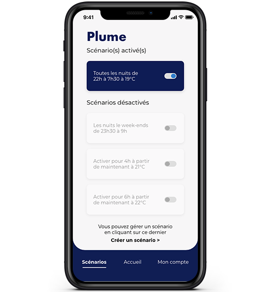 Vous pouvez créer des scénarios afin de programmer votre Plume et ne plus y pensez. Configurez vos horaires de coucher et de lever en semaine ou le weekend afin que Plume s'adapte à vos habitudes.
